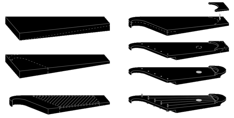 | G: | PONSI/TALLA Talla toimii kielten tukevana kiinnityskohtana, joka liimataan yleensä erillisenä kappaleena kannen päälle. Puuna suosittelen käyttämään kovia puulajeja kuten vaahteraa tai koivua. Tallan alle voidaan piilottaa myös kovasta puusta tehty sydän, joka muodostaa todellisen alustan kielten kiinnitykselle tallan ja ponnen toimiessa lähinnä esteettisenä tekijänä. Itse olen päätynyt käyttämään kovapuusydämiä kaikissa soittimissa.